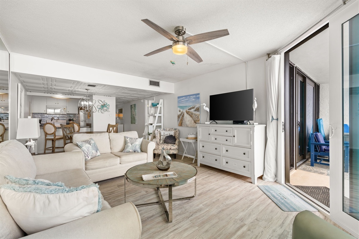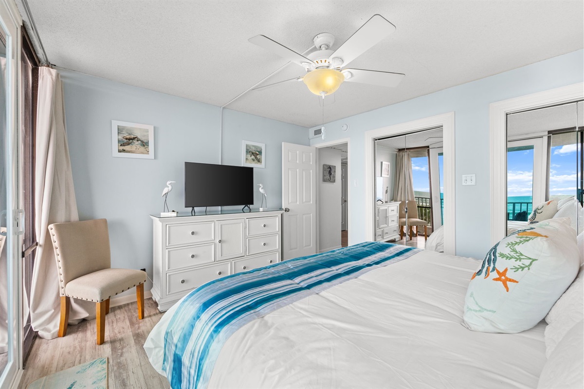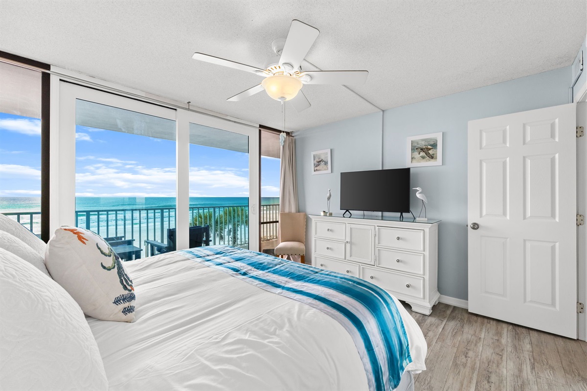 This recently renovated and beautifully decorated condo sleeps four to six with a king in the master bedroom and a queen sleeper sofa plus a double sleeper loveseat in the living room. The living room features comfy furniture, a Smart TV, and an amazing view of the Gulf that you can soak up from within the condo or from the private balcony. A fully-equipped kitchen is ready for any meals, drinks or snacks, plus a washer and dryer and free wifi are offered for the ultimate in convenience. We also have a twin rollaway bed if needed. Maximum occupancy is six (6).